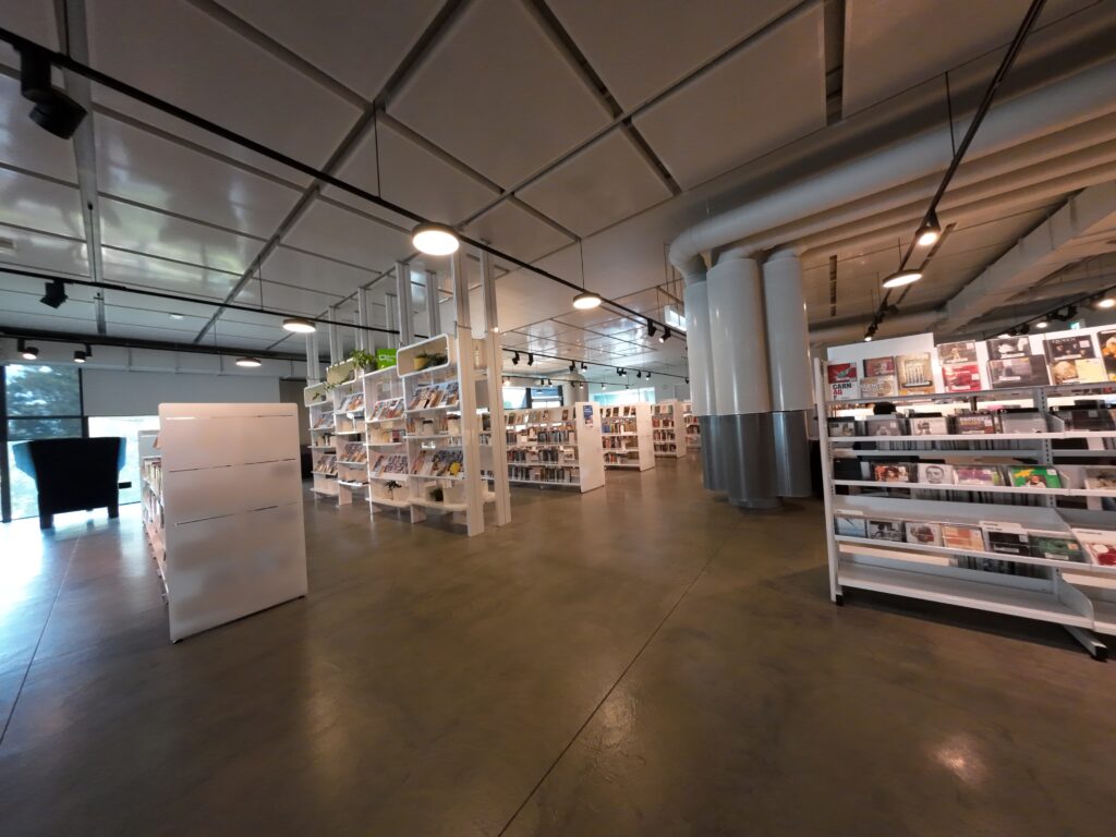書棚は白色で移動式,かつ全体的に低い。4段で,一番上の段は表紙が見えるように置く棚になっていた。全体として排架する冊数は抑えめである。資料には RFID が貼付されている。装備は,ペーパーバックにはブッカーがかけられ,ハードカバーには透明カバーが付いていた。複本は多くないが一定数あった。しかし,3冊以上の所蔵は見当たらなかった。3階は地域資料のフロアであり,アーカイブズや系図資料が置かれている。訪問日が土曜日であったため,閉室していた。4階には図書館システム全体の事務室があり,5階はかなり大きなイベントスペースとバルコニーがある。バルコニーからは公園,さらにコリオ湾がよく見える。