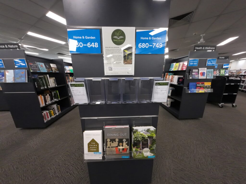 全体に複本はあまり多くなく,あっても2冊程度であった。但しOPACでみると,例えば1週間貸出の Mother Mary Comes to Me は,ムーニーバレー市全体で20冊あった。この図書館でも他館と同様,4段の書棚が使われており,一番上の段は面陳用である。図書の排架冊数は全体としてそれほど多くない。書架が低いため,館内の見通しがよい。種の図書館では,目録ケースではなくプラスチックケースに,専用の袋に入れた種が収められていた。OPACは SirsiDynix のものであった。入口付近には自動貸出機が4台設置されている。RFIDは背表紙にバーコードと一体になったものが貼られていた。館内にはPCが8台設置されており,いずれもよく利用されていた。ガラス張りのミーティングルームもいくつかある。