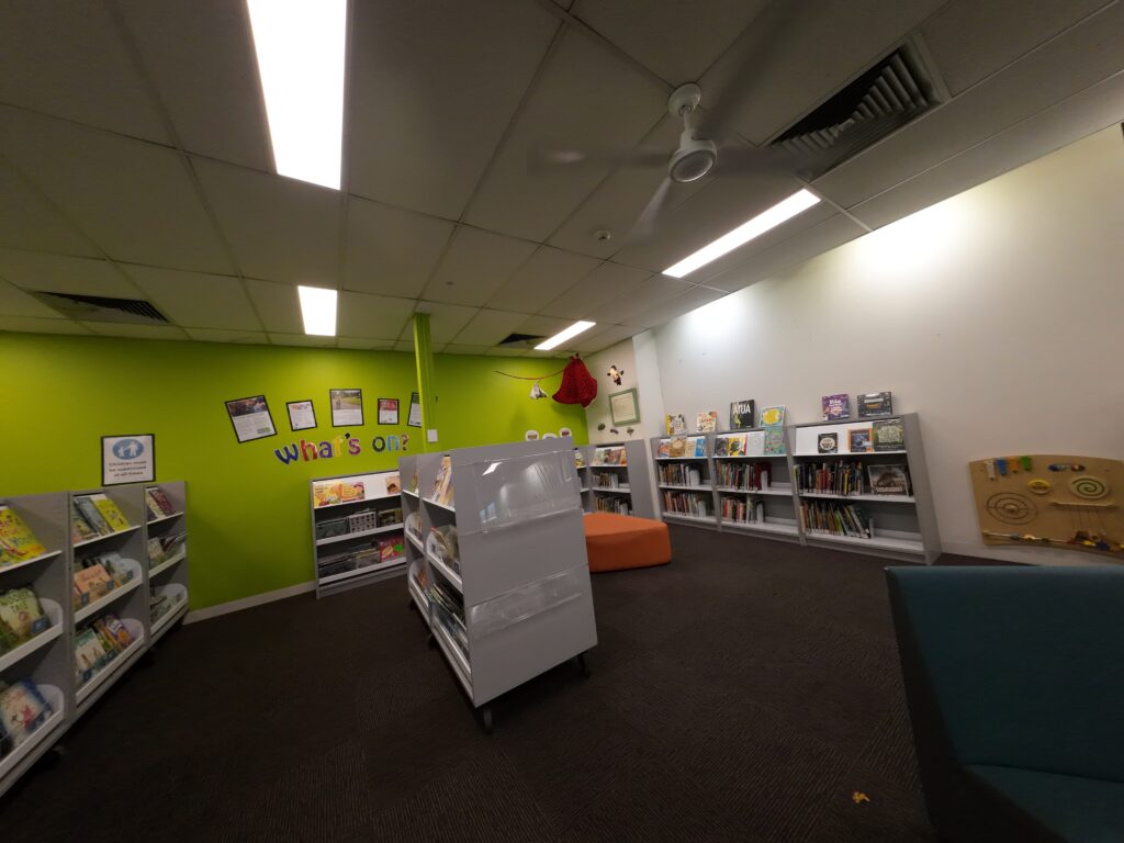 1階は,手前が児童コーナー,奥がTEENのコーナーである。土曜日ということもあり,多くの利用者がいた。入口付近には,木をくりぬいた書棚に絵本が排架されている。また,フロア中央にはアクティビティルームがある。屋外テラスも設けられていた。遊具やPCが置かれており,PCには子ども向けのゲームが入っている。マインクラフトをしている子どももいた。TEENのコーナーには,多くのソファと,ゲームができるディスプレイがあった。ここにはフィクション,DVD,コミックなどが排架されている。また,高校生向けの卒業・進学の問題集として,VCE Resources,Insight Comparison,Cambridge Checkpoint なども充実していた。